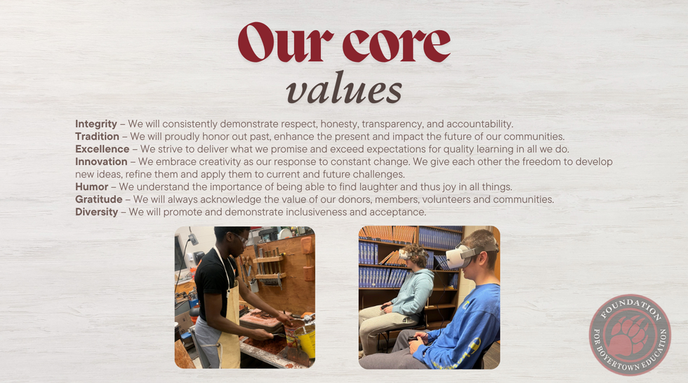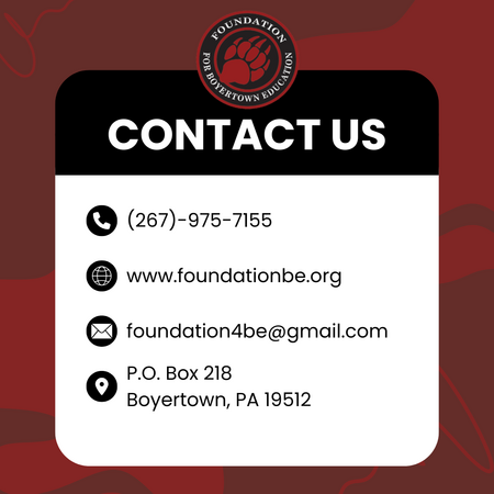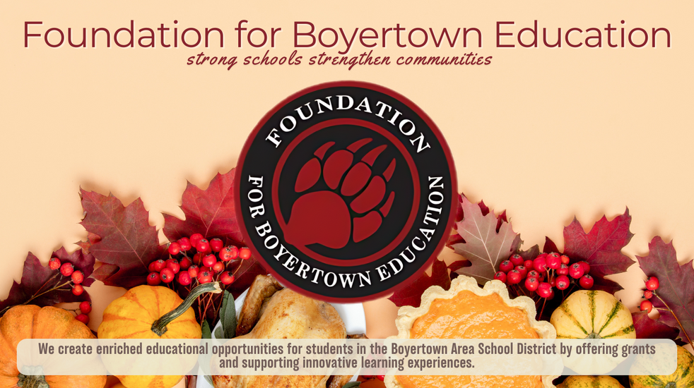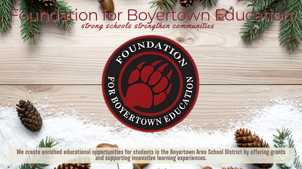 The Foundation, founded in 2013, is composed of community-based volunteers and is a registered and independent, 501 (c)(3), non-profit organization. A volunteer board of Boyertown residents and business leaders- representing a variety of communities throughout our district-raises and allocates funds independent of the Boyertown Area School Board and District.